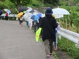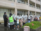 とうとう降り出した雨でしたが、1,2年生はランドセルを背負って傘をさして道路の歩き方を練習しました。安心安全課の方々、交通指導員の方々、そしてボランティアの保護者のみなさんがお手伝いをしてくださいました。まず最初に横断歩道を歩く時の約束を確認しました。「横一列、右、左、右、手を上げて横断」みんなで大きな声で練習します。さあ、いよいよ実際に道路に出て練習をします。班ごとに保護者の方が一緒に歩いて見守ってくださいます。2年生は時々後ろを歩く1年生の様子をみながら、1年生も傘を上手にさして、仲良く一列で歩きます。信号のある横断歩道も信号のない横断歩道もよく安全確認して練習通りに上手に歩くことができました。登下校は毎日のことです。晴れの日ばかりではありません。傘をさしたり、荷物をたくさんもったり、いろんな日があります。でも安全を確認することはいつでも同じです。「自分の命は自分で守る」ためにも今日練習したことを毎日ちゃんと実践してほしいと思います。たくさんのみなさんのご協力をいただいて、とてもいい練習ができました。ありがとうございました。